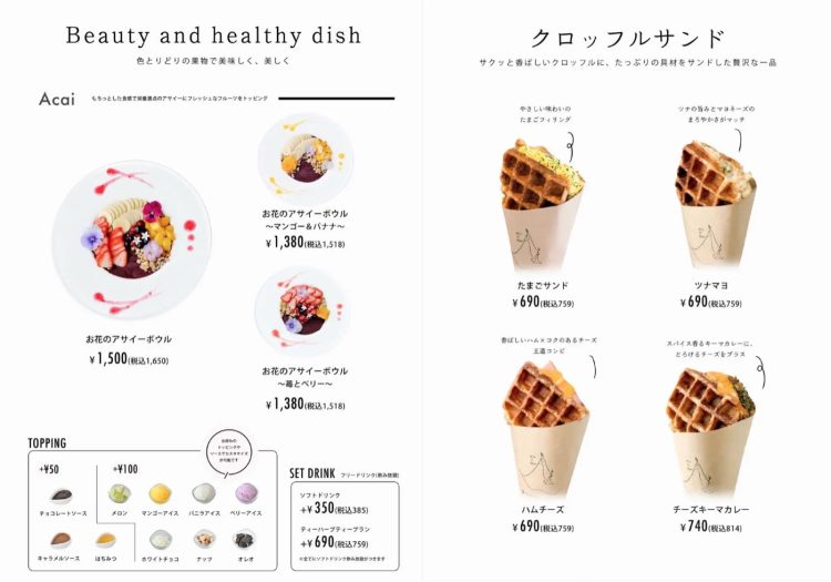 メニューには、美と健康を意識したエディブルフラワーがのった鮮やかなアサイーボウルや、名物のクロッフルを始め、写真映えもするクロッフルプレートなどの人気メニューが大阪でも展開されます。