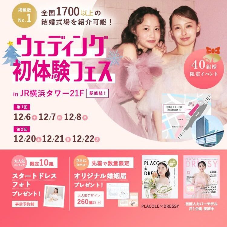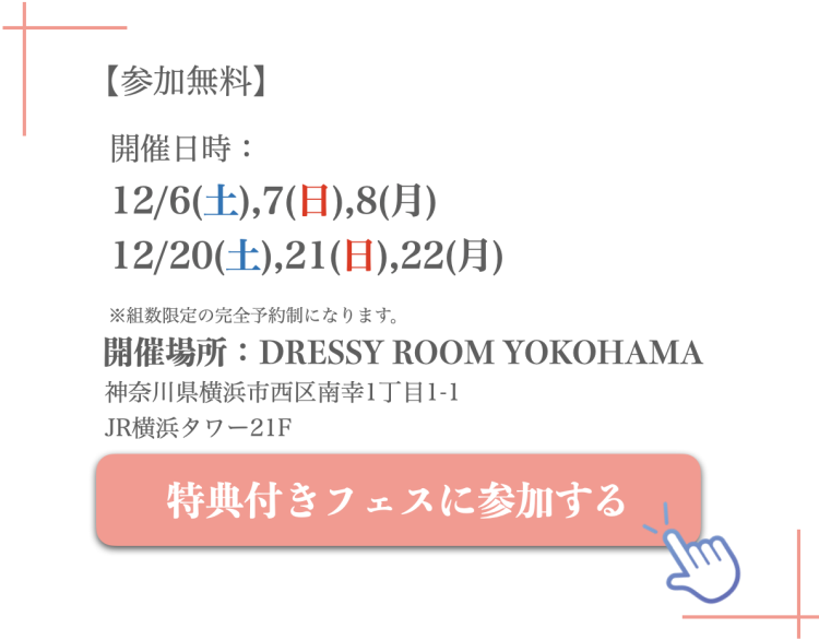 結婚式場相談や、ドレス試着、フォト体験、見積もり相談など、花嫁に必要な情報を一度に得られます。