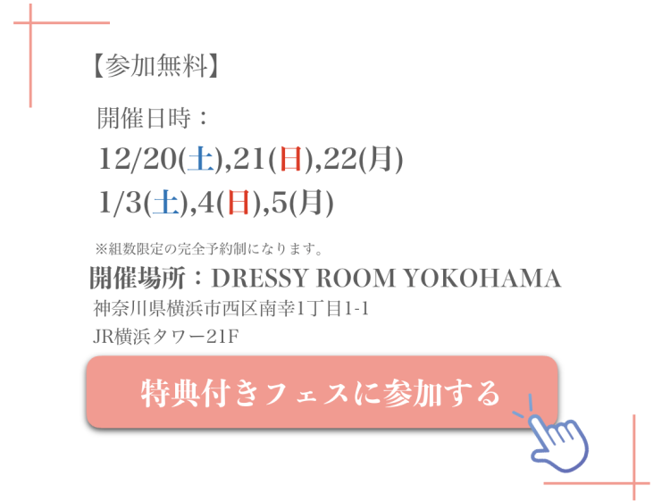 結婚式場相談や、ドレス試着、フォト体験、見積もり相談など、花嫁に必要な情報を一度に得られます。