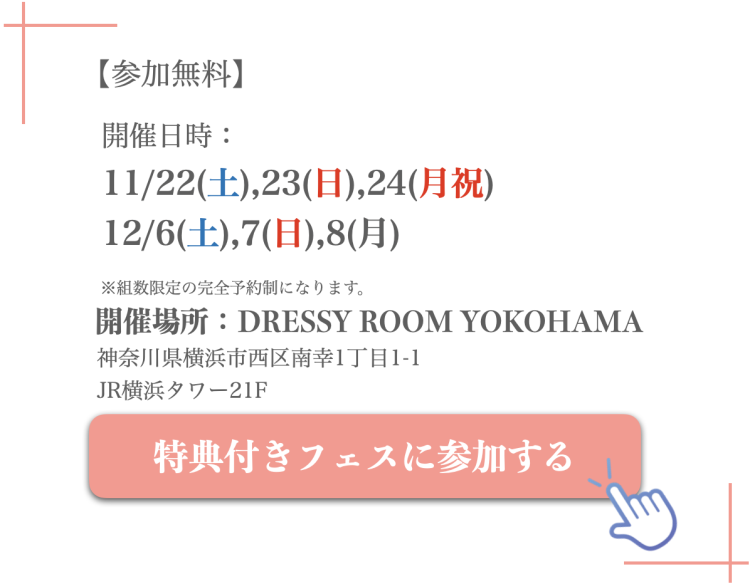 結婚式場相談や、ドレス試着、フォト体験、見積もり相談など、花嫁に必要な情報を一度に得られます。