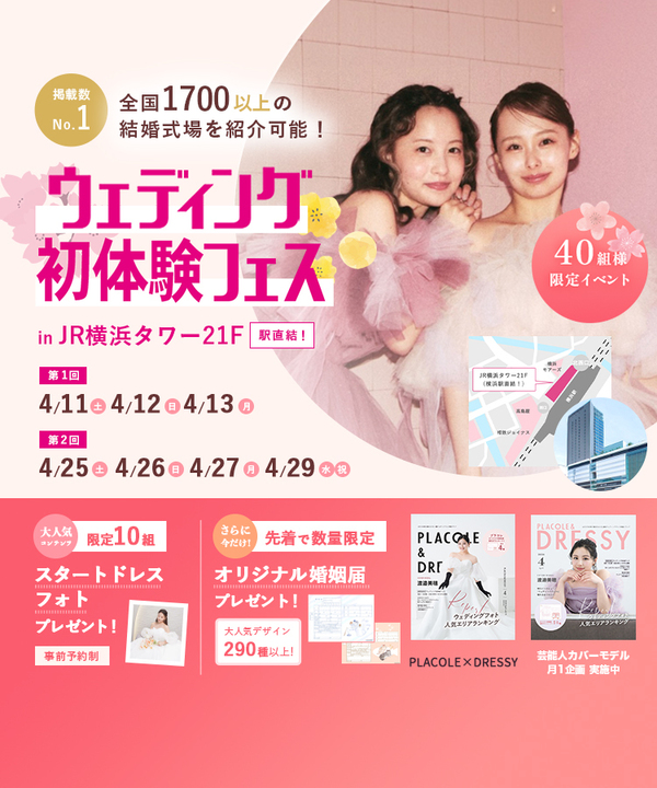 みなさん、こんにちは* 昨年も大好評だった 初体験フェスの開催が決定いたしました!! 次回開催は4/11(土),12(日),13(月)限定!! ご予約が埋まりましたら ご案内が難しくなってしまいますので、 お早めにご予約くださいませ^^ 限定特典付きの相談会で参加無料! 1日組数限定のフェスで、 1組ずつ丁寧にご案内させていただきます◎ 入場は完全無料! おひとりでもお子様連れでも お気軽にご参加いただけます^^ ▶︎Googleマップ 豪華特大特典も?! 今だけ限定! PLACOLE&DRESSYオリジナル婚姻届プレゼント!! 総DL数、25万件を超 … 続きを読む 【4/11(土),12(日),13(月)限定!】豪華特典つき!<横浜駅直結>結婚式場相談やスタートドレスフォトもできちゃう♡ウェディング初体験フェス in 横浜⚐