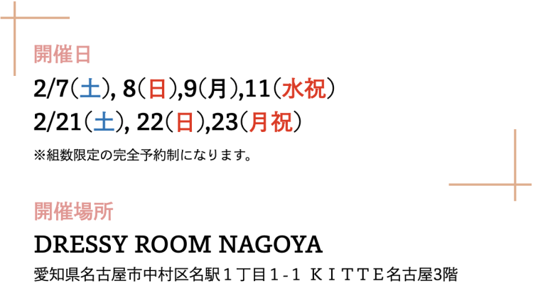結婚式場相談や、ドレス試着、フォト体験、見積もり相談など、花嫁に必要な情報を一度に得られます。
