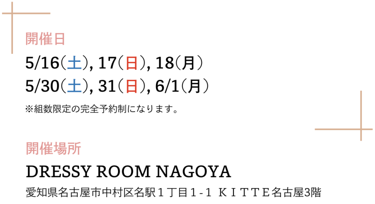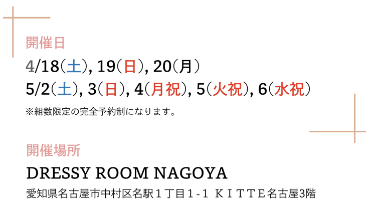結婚式場相談や、ドレス試着、フォト体験、見積もり相談など、花嫁に必要な情報を一度に得られます。