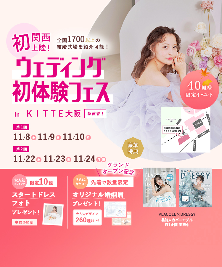 【11/8(土),9(日),10(月)限定プレオープン!】関西初上陸!<大阪駅直結>結婚式場相談やスタートドレスフォト、前撮りも相談できちゃう♡ウェディング初体験フェス in 大阪⚐