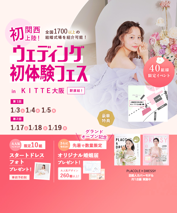 みなさん、こんにちは! これまで横浜・名古屋で大好評をいただいている 体験型カウンターがついに大阪初上陸! グランドオープンを記念して、 1/3(土),4(日),5(月)に特別開催が決定!! ご予約が埋まりましたら ご案内が難しくなってしまいますので、 お早めにご予約くださいませ^^ ▶︎Googleマップ グランドオープン記念の 豪華特大特典もチェック! PLACOLE&DRESSYオリジナル婚姻届プレゼント!! 総DL数、25万件を超える! 『PLACOLE&DRESSY婚姻届』を 当日フェア予約をいただきましたお客様に お好きなデザインをプレゼントさせていただきます! ぜひ事前にお好みの … 続きを読む 【1/3(土),4(日),5(月)限定!】関西初上陸!<大阪駅直結>結婚式場相談やスタートドレスフォトもできちゃう♡ウェディング初体験フェス in 大阪⚐