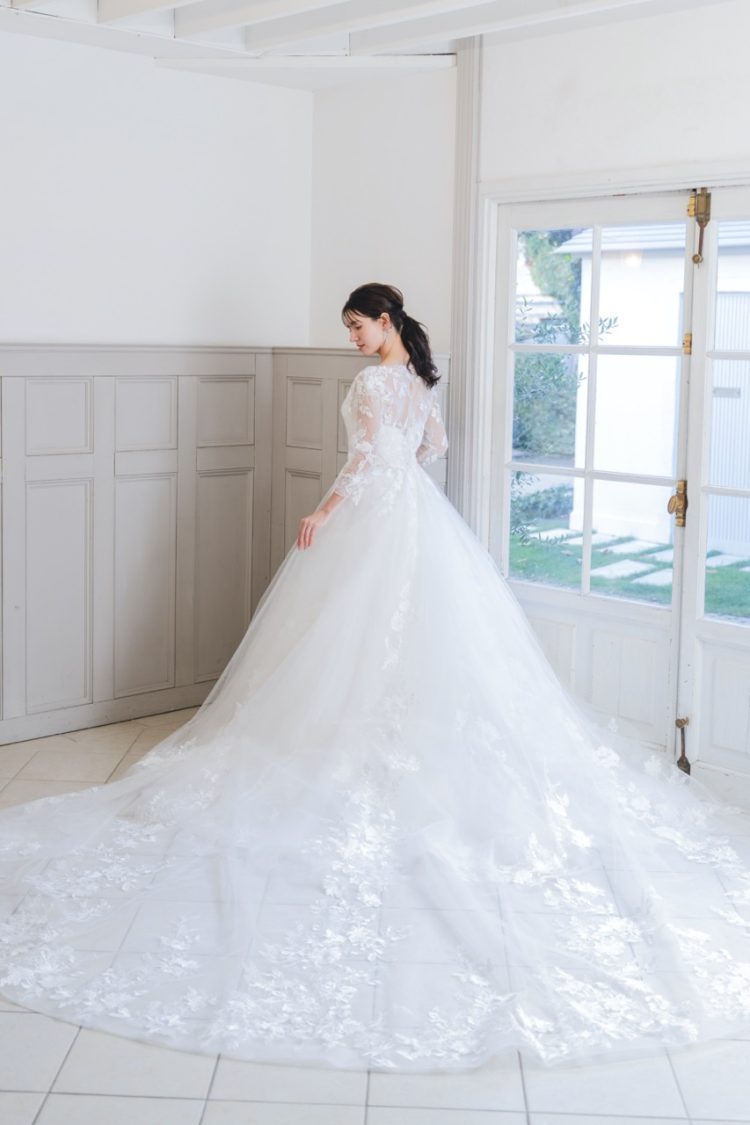 華やかなロングトレーンが存在感を放ち、バックスタイルも美しく見せてくれるフォトジェニックなデザインとなっています。