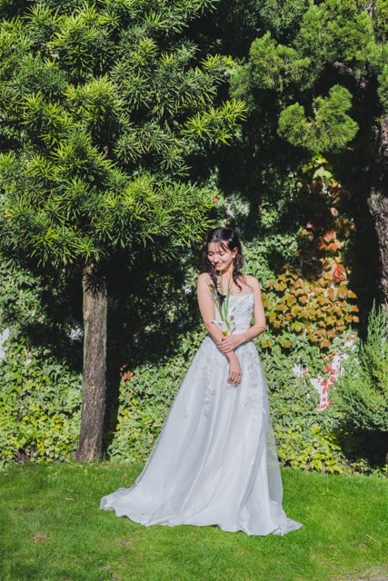 レースが優しくあしらわれ、動くたびに柔らかく光を受けて輝くデザインのドレスです。