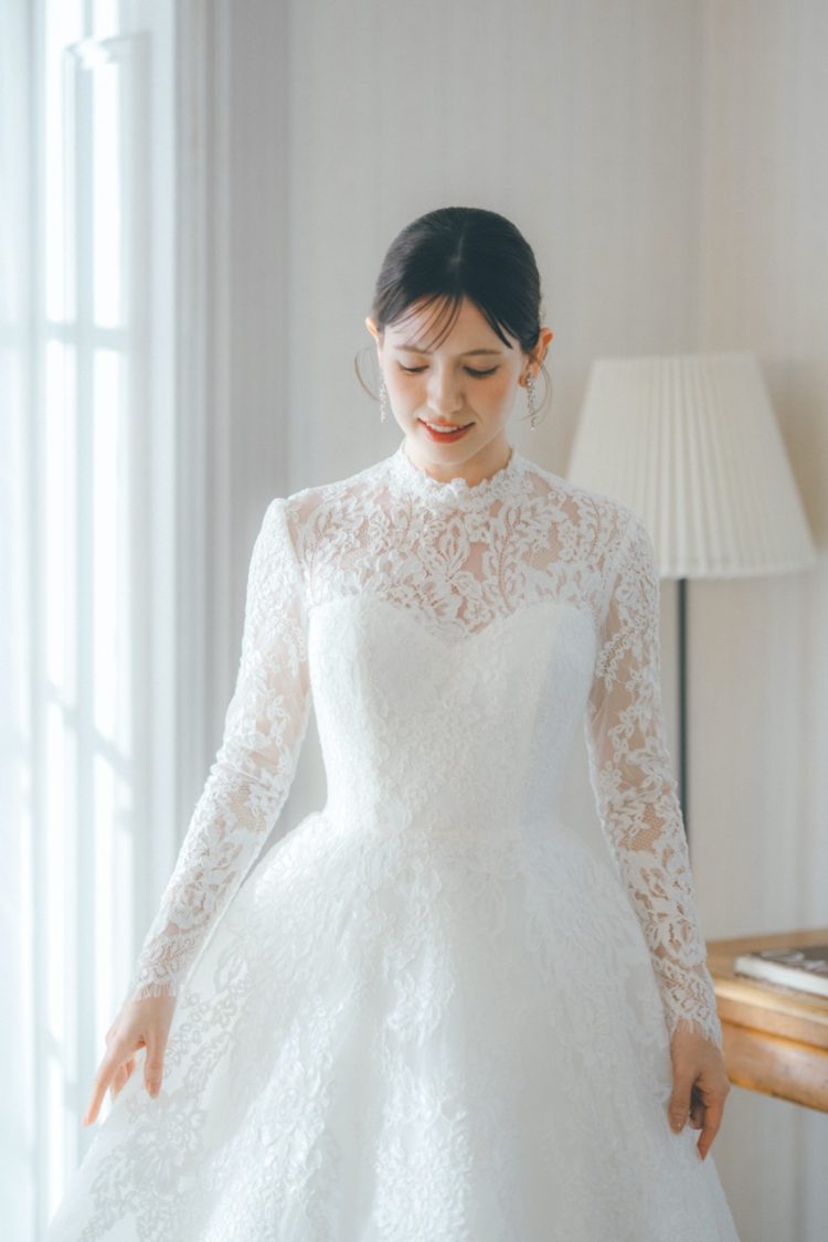 高めのネックラインはよりクラシカルで上品さを演出し、思わず目を奪われるような優雅なデザインとなっています。