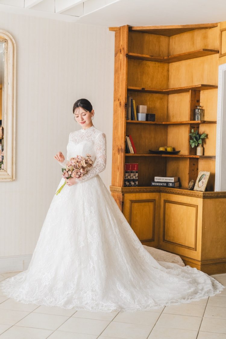 贅沢に360°レースを使用した、優雅で格式高いデザインが印象的なドレス。