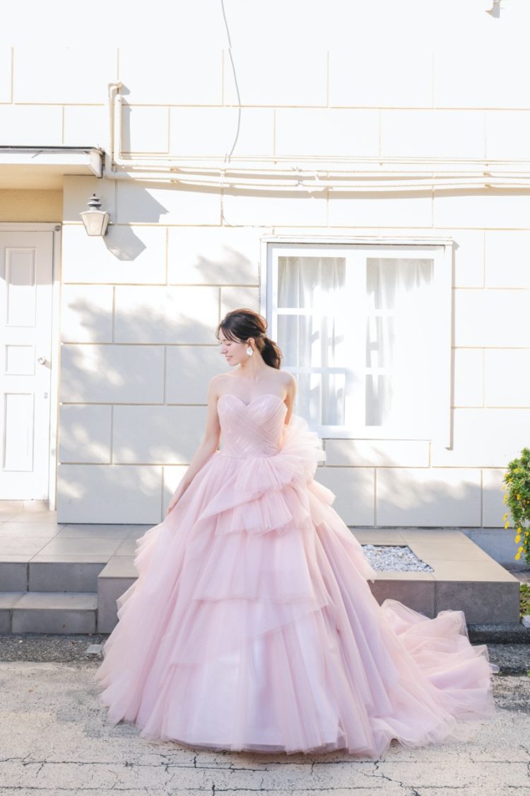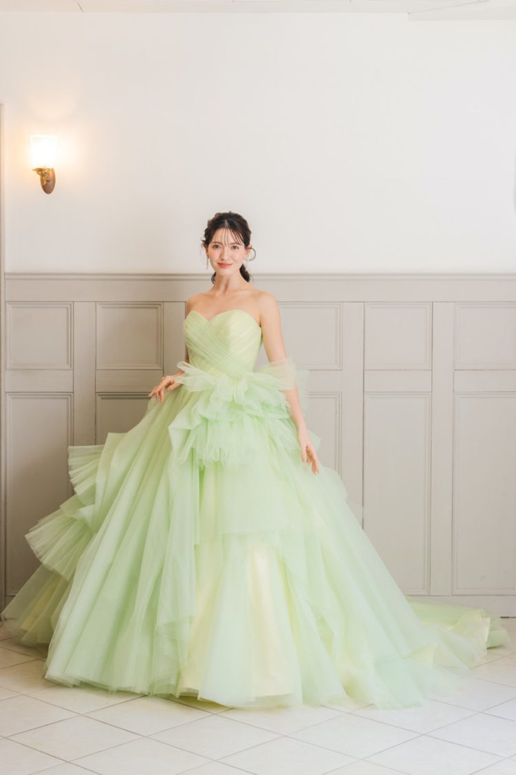 オフホワイトの他、ピンク・ラベンダー・グリーンのパステルカラーのカラードレスも製作し、レパートリー豊かなラインナップに。