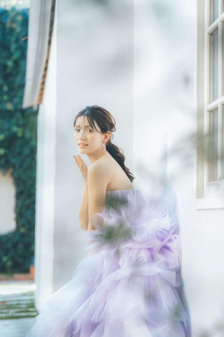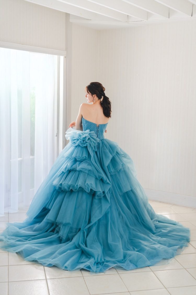 チュールを何層にも重ね、見る角度によって表情が変わるように、細かい部分までとことんこだわったプリンセスラインドレス。