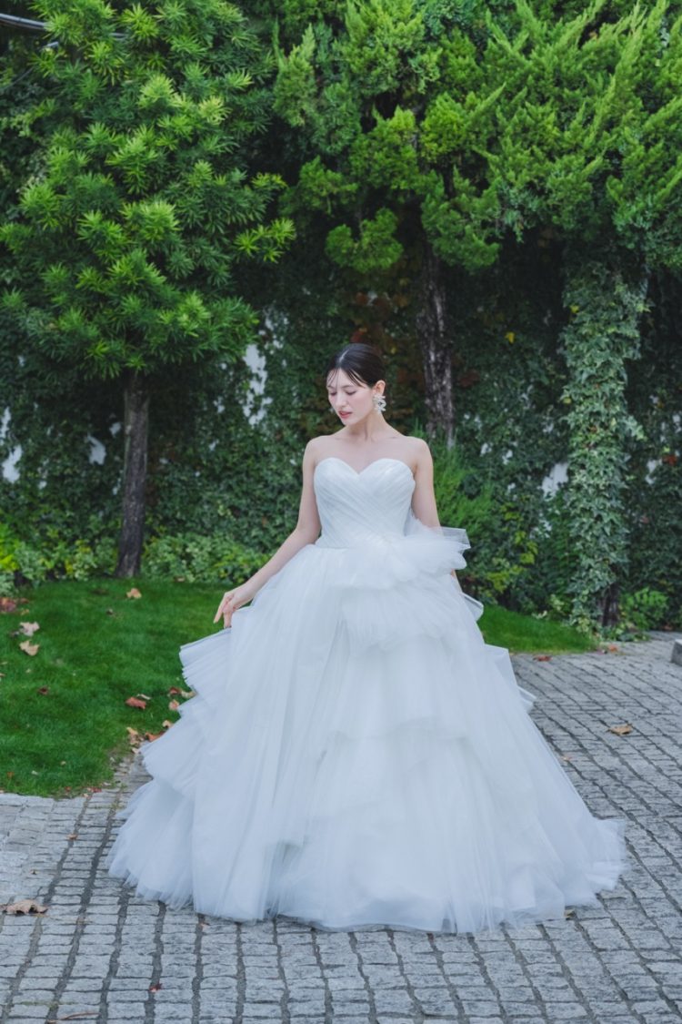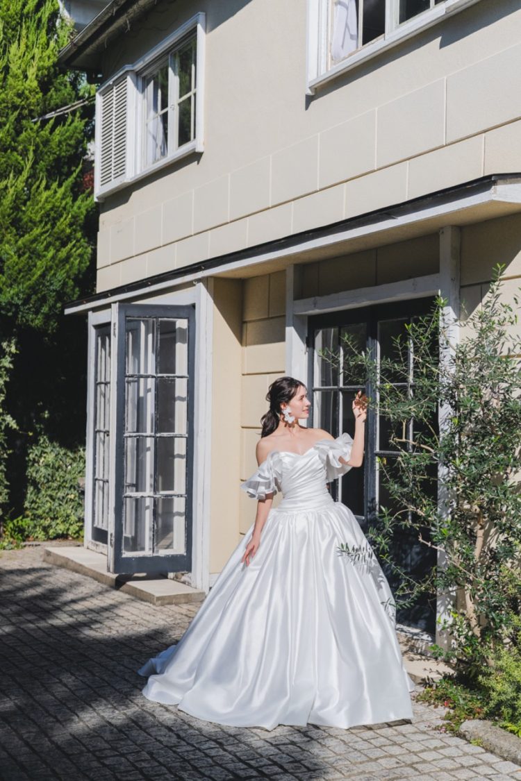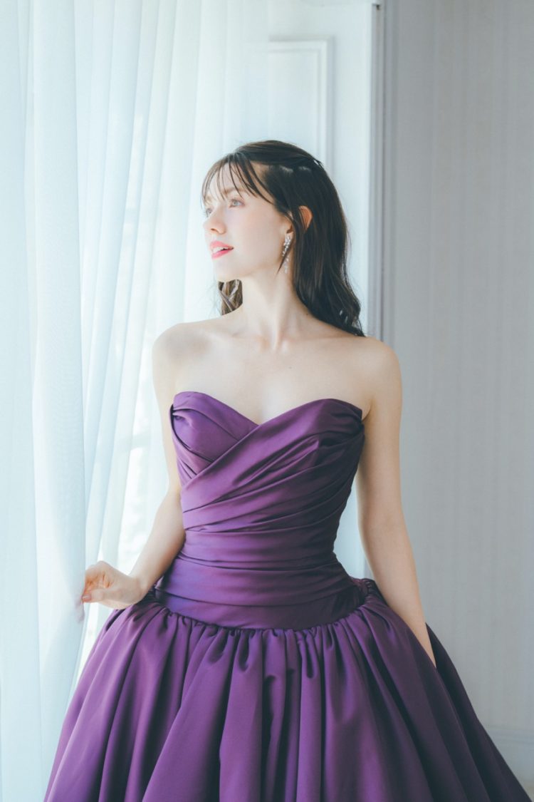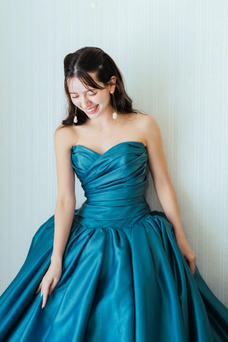 胸元はハートカットで優美なラインを描き、ウエストには細かなタックを寄せることで、程よい立体感と美しいシルエットを実現しています。