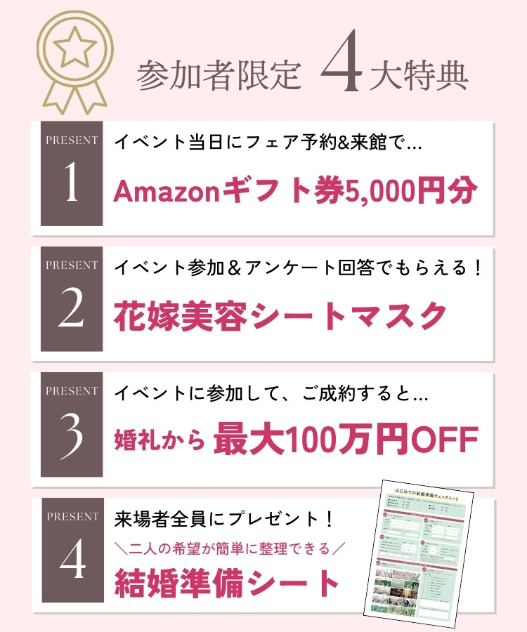 婚礼から最大100万円OFFなど盛りだくさん♡