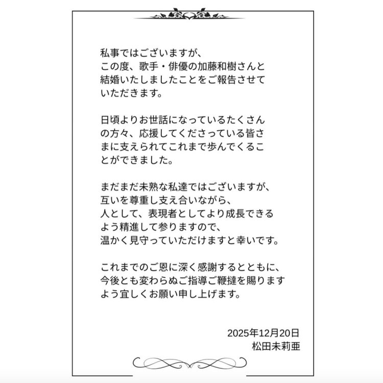 この度、舞台女優の松田未莉亜さんと入籍いたしましたことをご報告させていただきます。