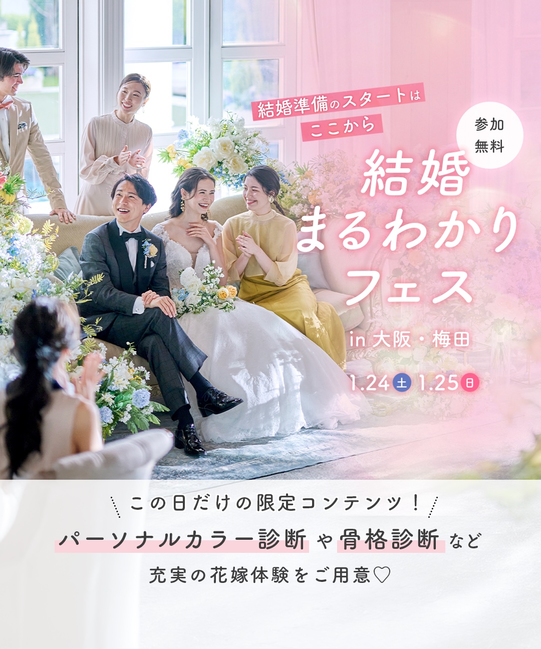 結婚まるわかりフェスとは? 【参加無料】コンテンツ一覧 今回の【結婚まるわかりフェス】のポイントは… ドレス選びに欠かせない カラー診断や骨格診断などの 体験コンテンツを楽しみながら 結婚式場探しもできる 『体験型』のイベントであること。 最新のトレンド衣装を見たり、 関西エリアの人気式場を比較相談することもできる 結婚が決まったばかりの花嫁さまにピッタリのイベントなんです! こんな思いの花嫁さまはぜひcheckしてくださいね* 日程・会場(アクセス)はこちら! 今回はDRESSY読者さま限定! 無料でイベントにご招待しちゃいます♡ 今すぐスケジュール帳を chec … 続きを読む 残枠わずか!1/24(土)25(日)結婚式場探しを始める花嫁におすすめ【結婚まるわかりフェス】カラー診断や骨格診断などの体験コンテンツを楽しみながら効率よく情報収集♪