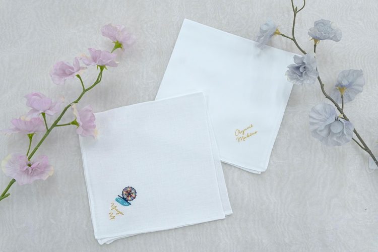 大切な人の名前とアイコンを刺繍した、特別な白いハンカチ。
