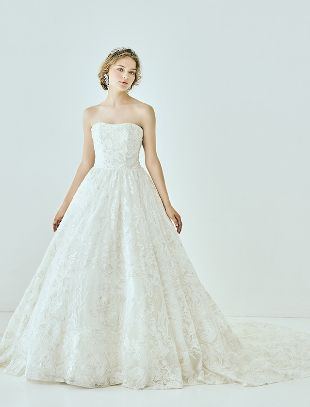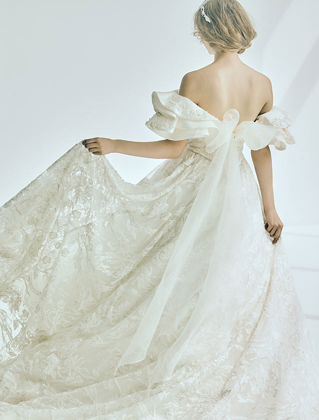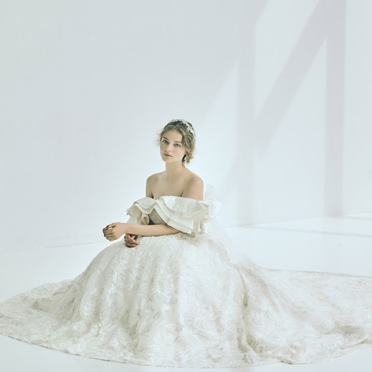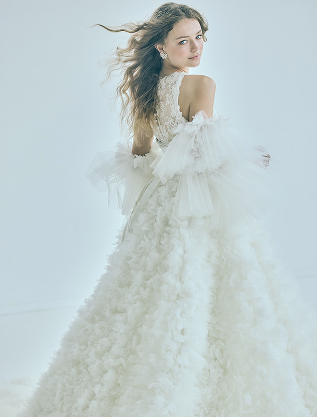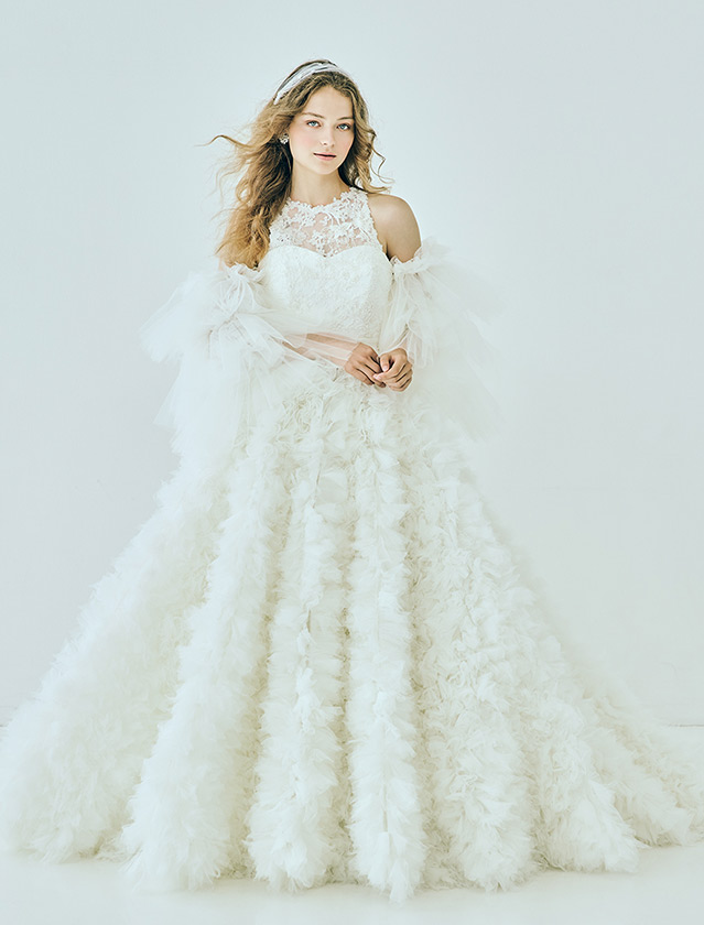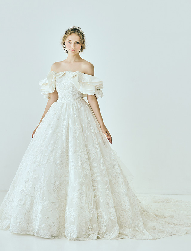 全身を彩る贅沢なビジュー刺繍レースが、ため息がこぼれるほど優雅な存在感を放つロングトレーンドレス。クラシカルで気品あるオフショルダーのフリルトップは取り外しが可能で印象を自在に変化させるスタイルチェンジにも対応◎