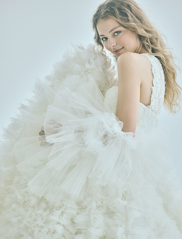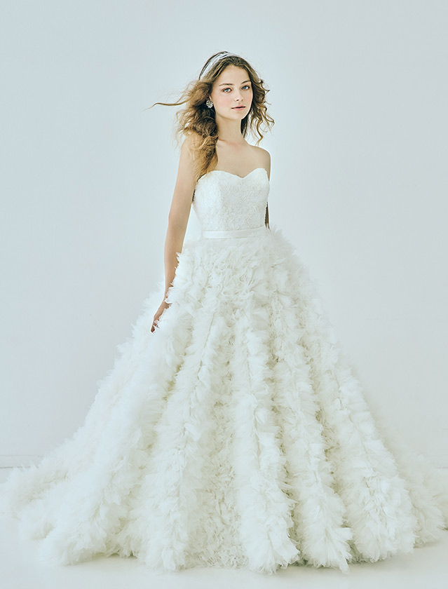 コードリバーレースと無数のチュールフリルが織りなす、まさに究極の”ゴージャス”を表現したウェディングドレス♡