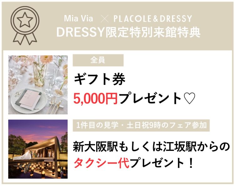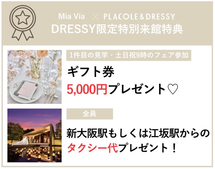 ※ギフト券5000円プレゼントは、MiaViaが1件目の見学かつ新郎新婦で土日祝9時のフェアご参加限定。