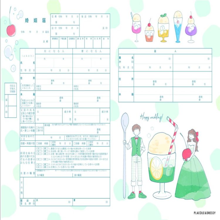 和のイメージを大事にしながらもポップで華やかな婚姻届ですね。