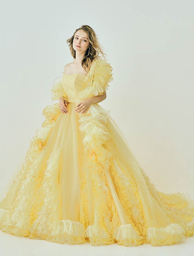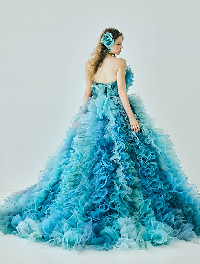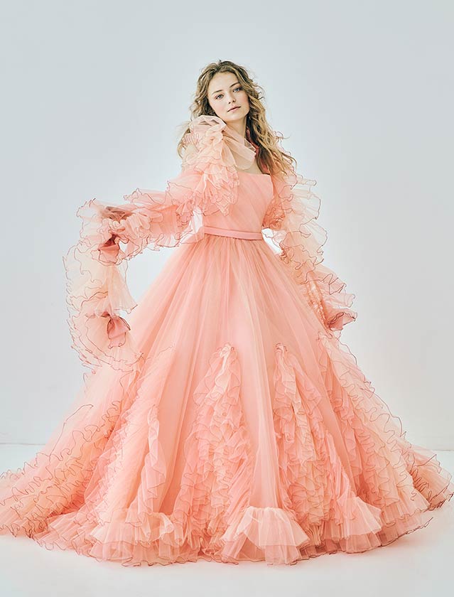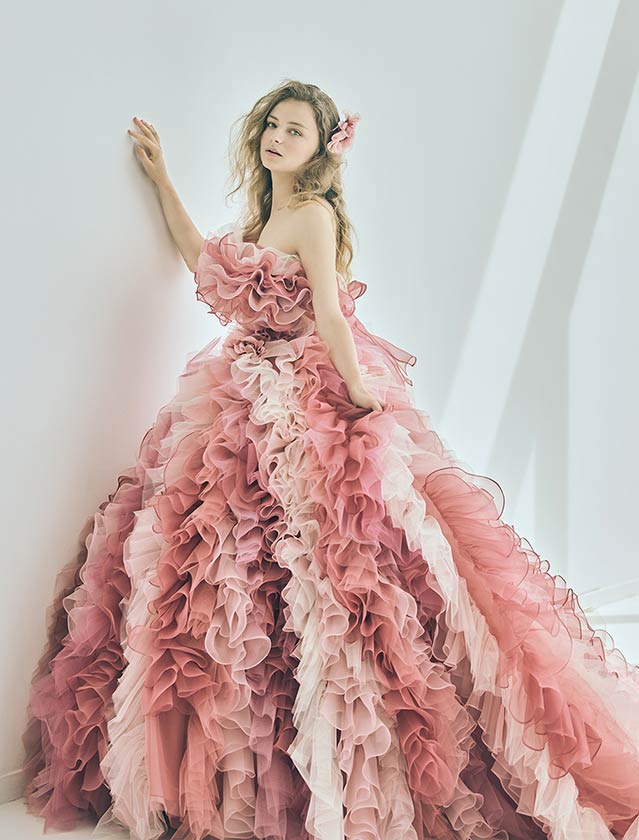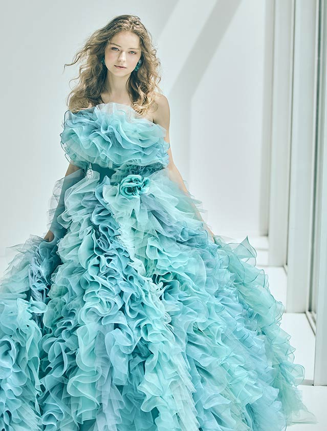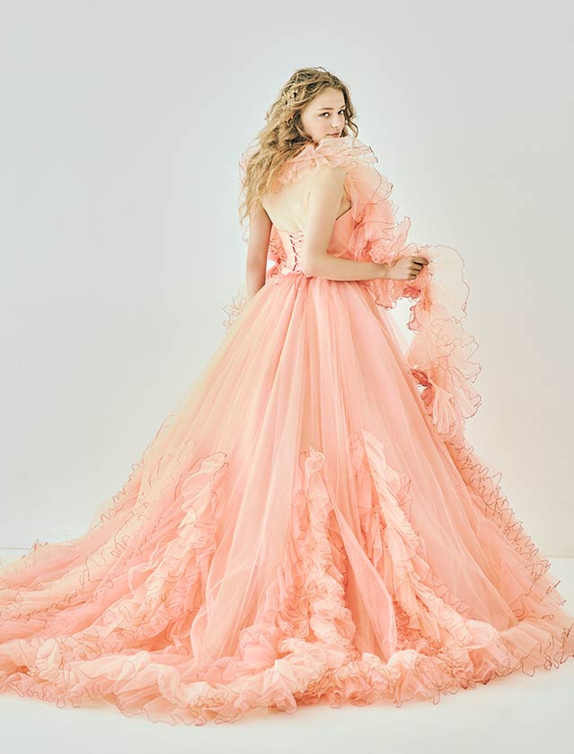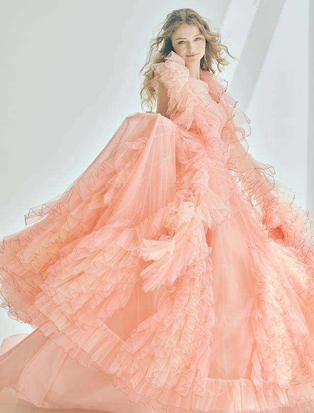 ピュアで可憐な、愛されヒロインスタイル。たっぷりのフリルと柔らかなチュールが空気を含み、軽やかに舞うようなシルエットが特徴的なカラードレス。