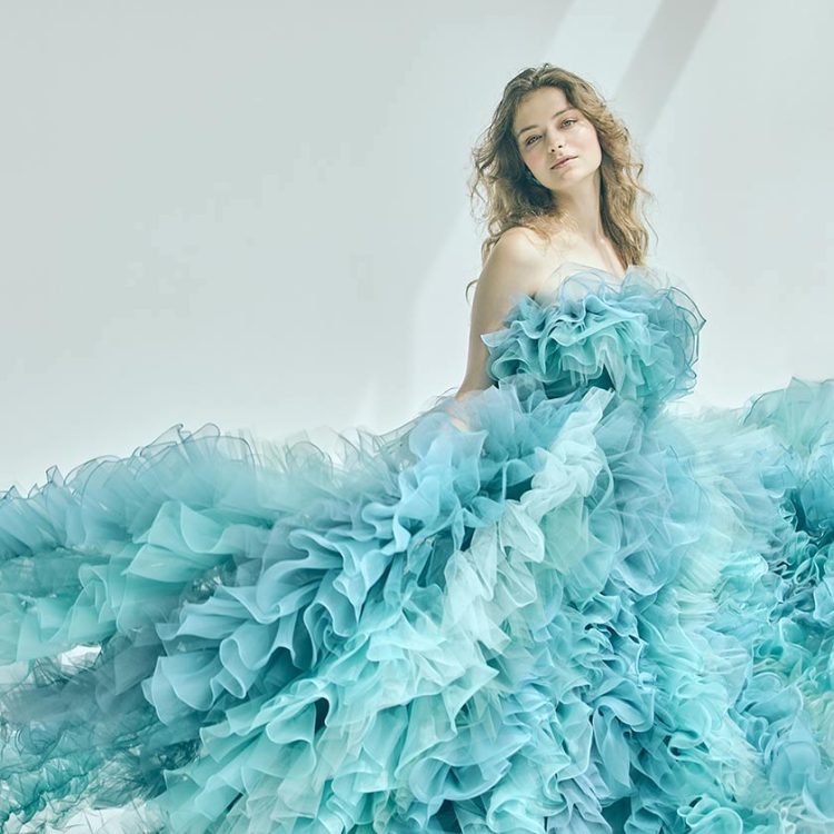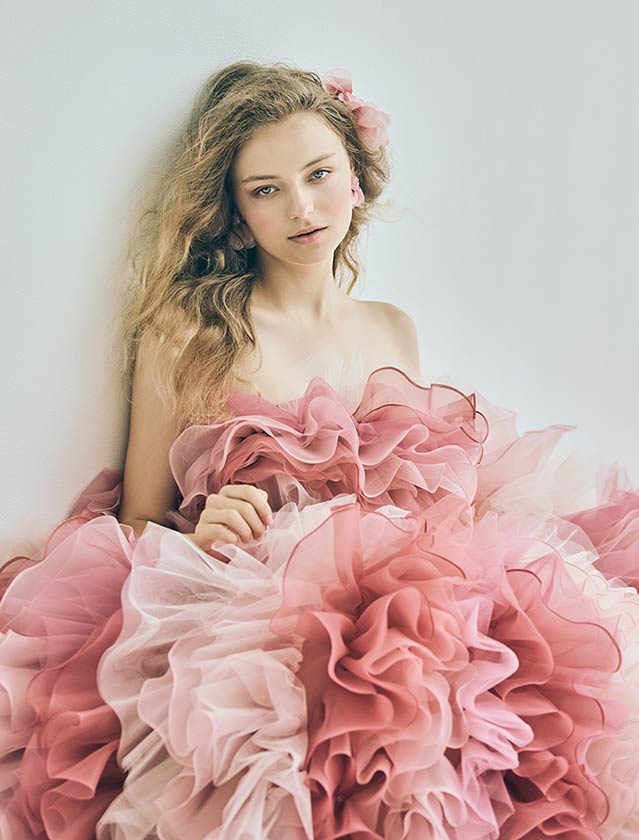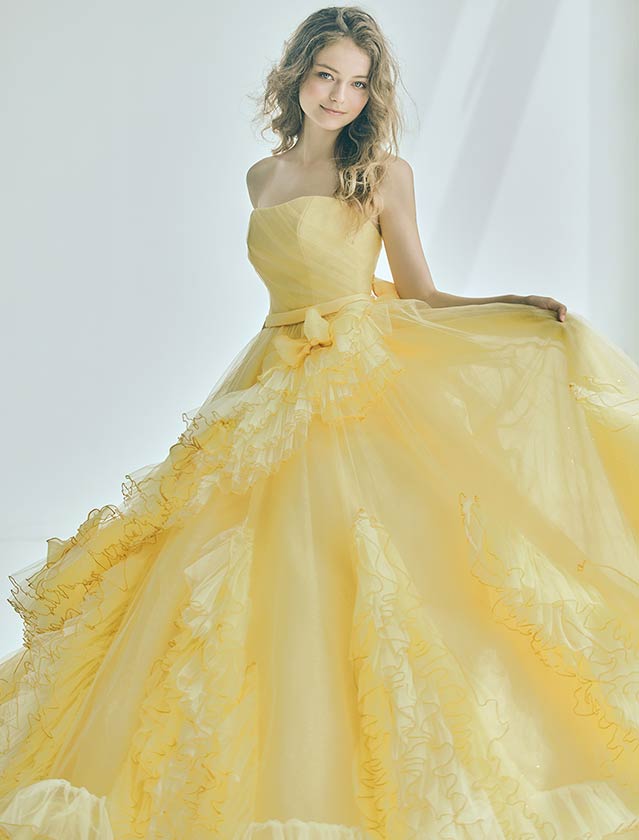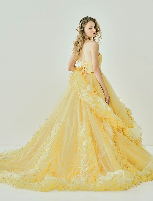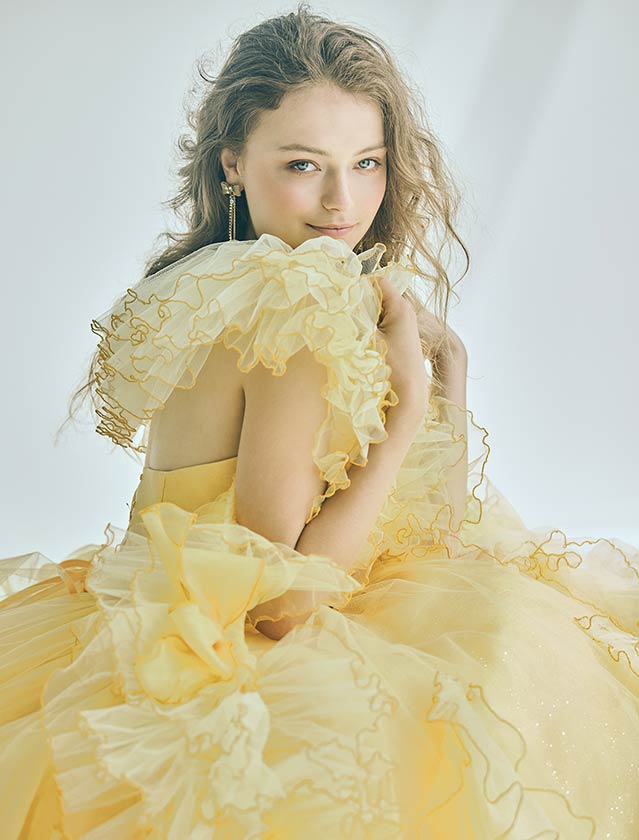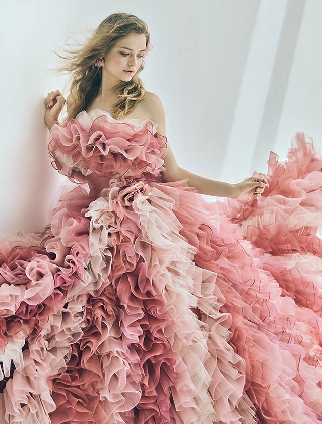 ピュアで可憐な、愛されヒロインスタイル。たっぷりのフリルと柔らかなチュールが空気を含み、軽やかに舞うようなシルエットが特徴的なカラードレス。