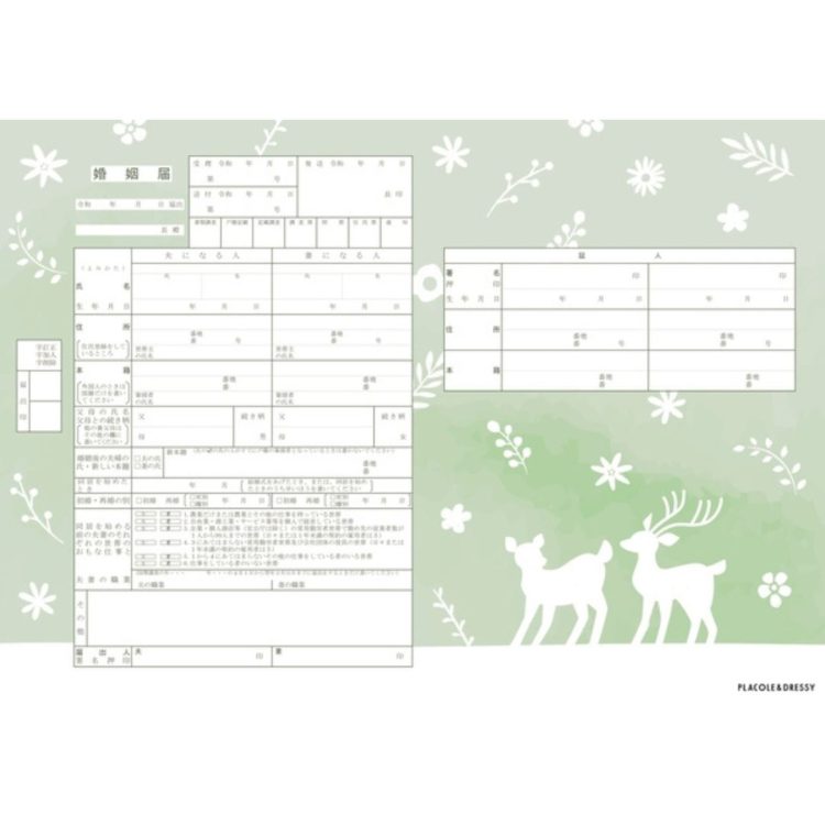 奈良県のご当地オリジナル婚姻届のデザインは、県を代表する動物「鹿」をテーマに作成。春先から初夏を感じさせるグリーンが爽やかで素敵。