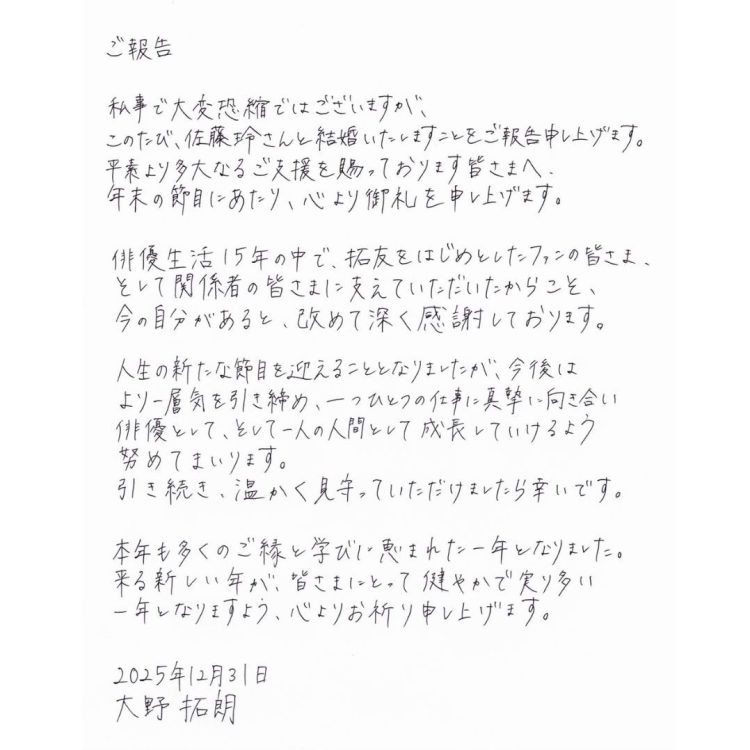 俳優の大野拓朗さんと女優の佐藤玲さんが、2025年12月31日にそれぞれのSNSを更新し、結婚したことを発表しました。