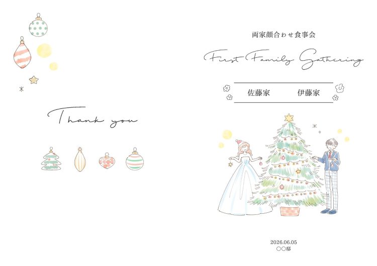 仲良くツリーを飾りつける新郎新婦の姿がかわいらしく、さりげなく描かれたオーナメントが大人っぽいおしゃれさを演出します。