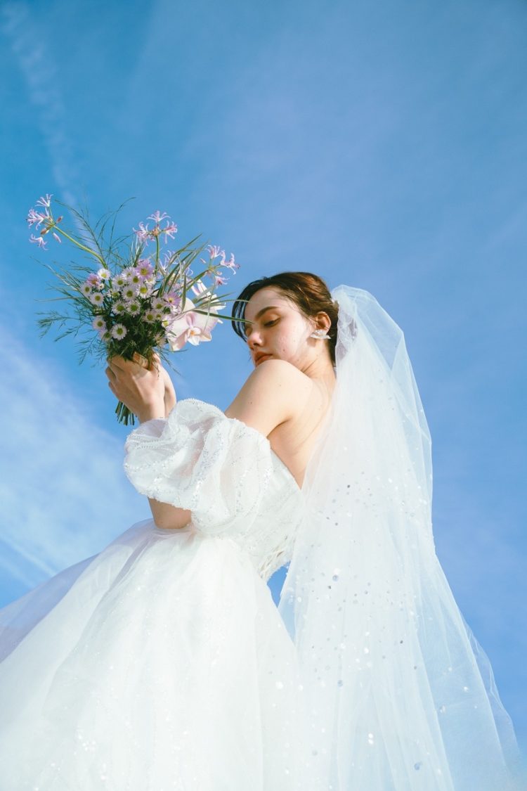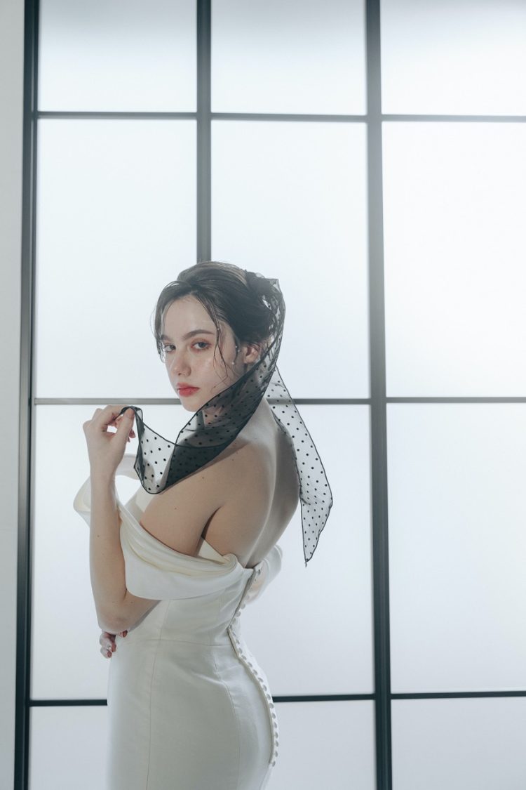 シンプルで洗練されたマーメイドラインのドレス。程よい光沢感で、上品さの中に女性らしい柔らかさを演出。主役として堂々と特別な日を迎えていただきたいという想いが込められています。