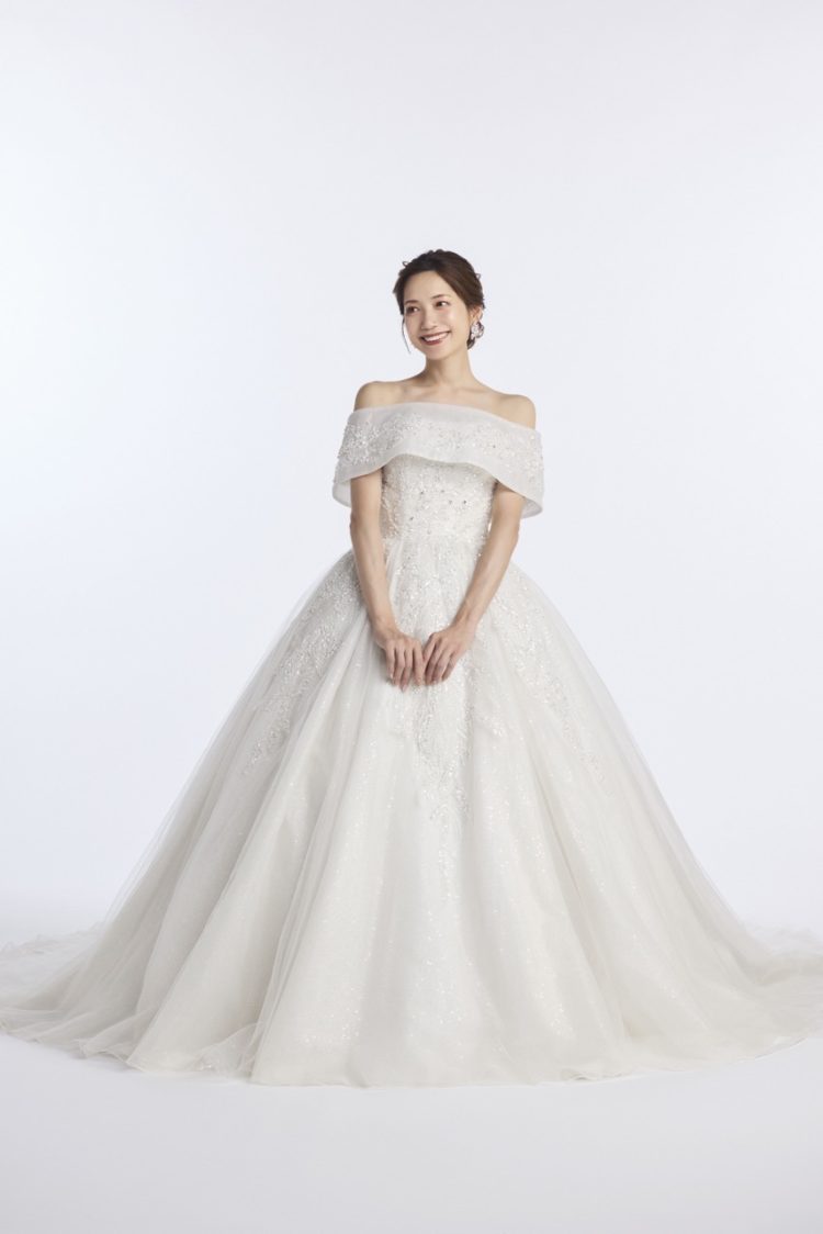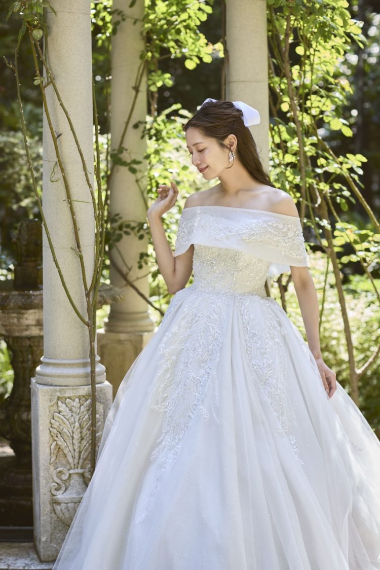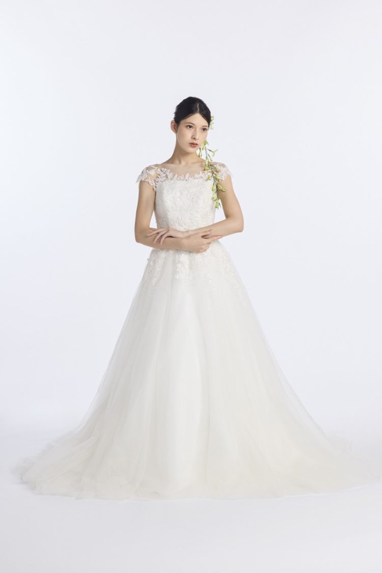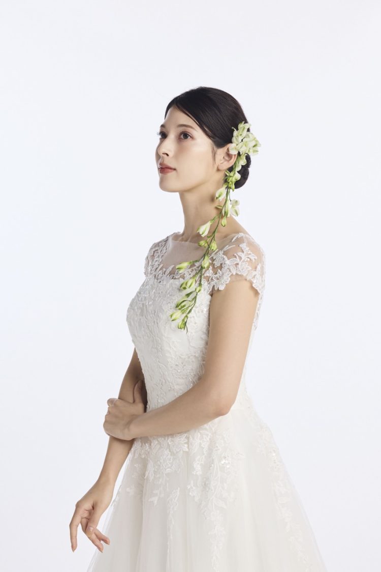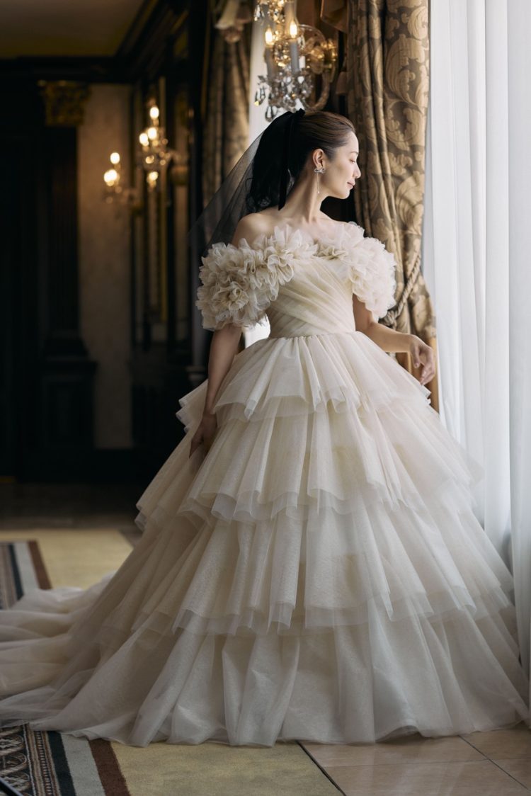フォトウエディングでの見え方にもこだわり、写真映えする立体感と光の透け感を追求しており、自然光の中でもスタジオ撮影でも、美しく存在感を放つウエディングドレスに仕上がっています◎