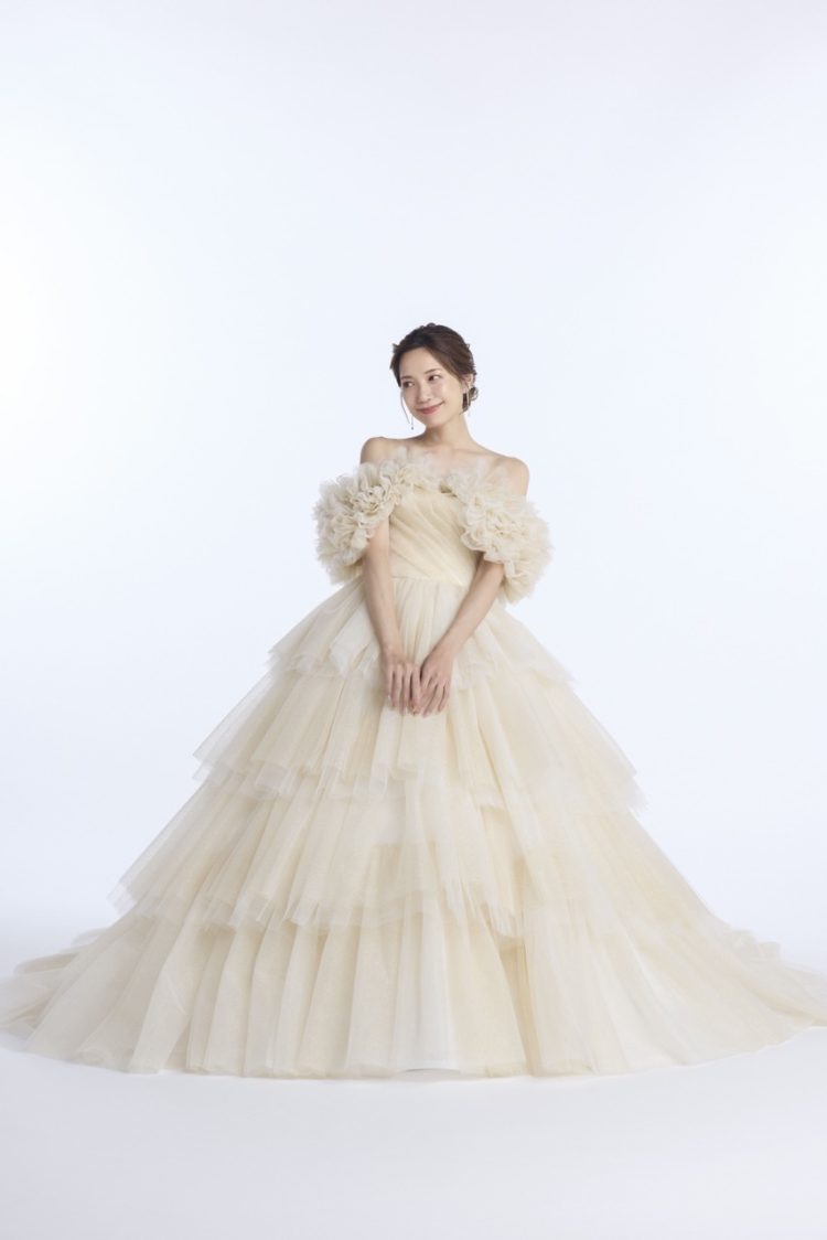 ゴールドのチュールの上にオフホワイトのチュールを重ね、柔らかな透け感でほんのりとした色味を表現した一着。
