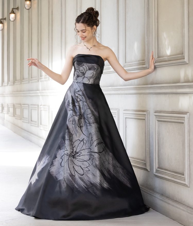 ミカド素材に躍動感のある柄を大胆に描いたAラインのブラックドレスです。