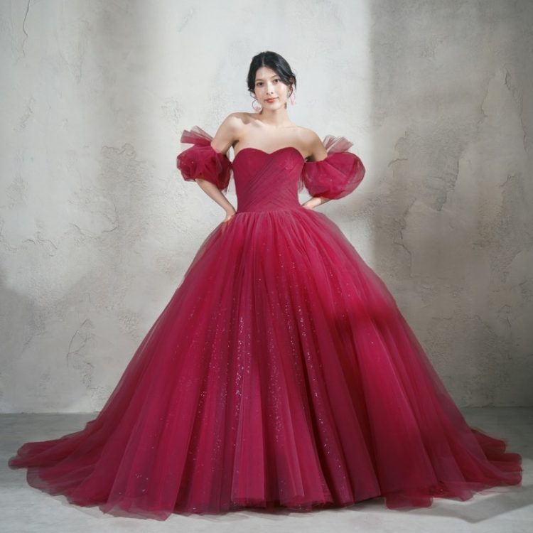 キラキラのスカートにプレーンなドレープの装飾、2段階で取り外しができるパフスリーブとフリルモチーフさが人気のドレス♡