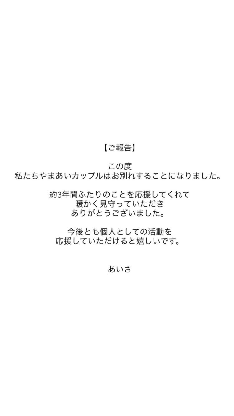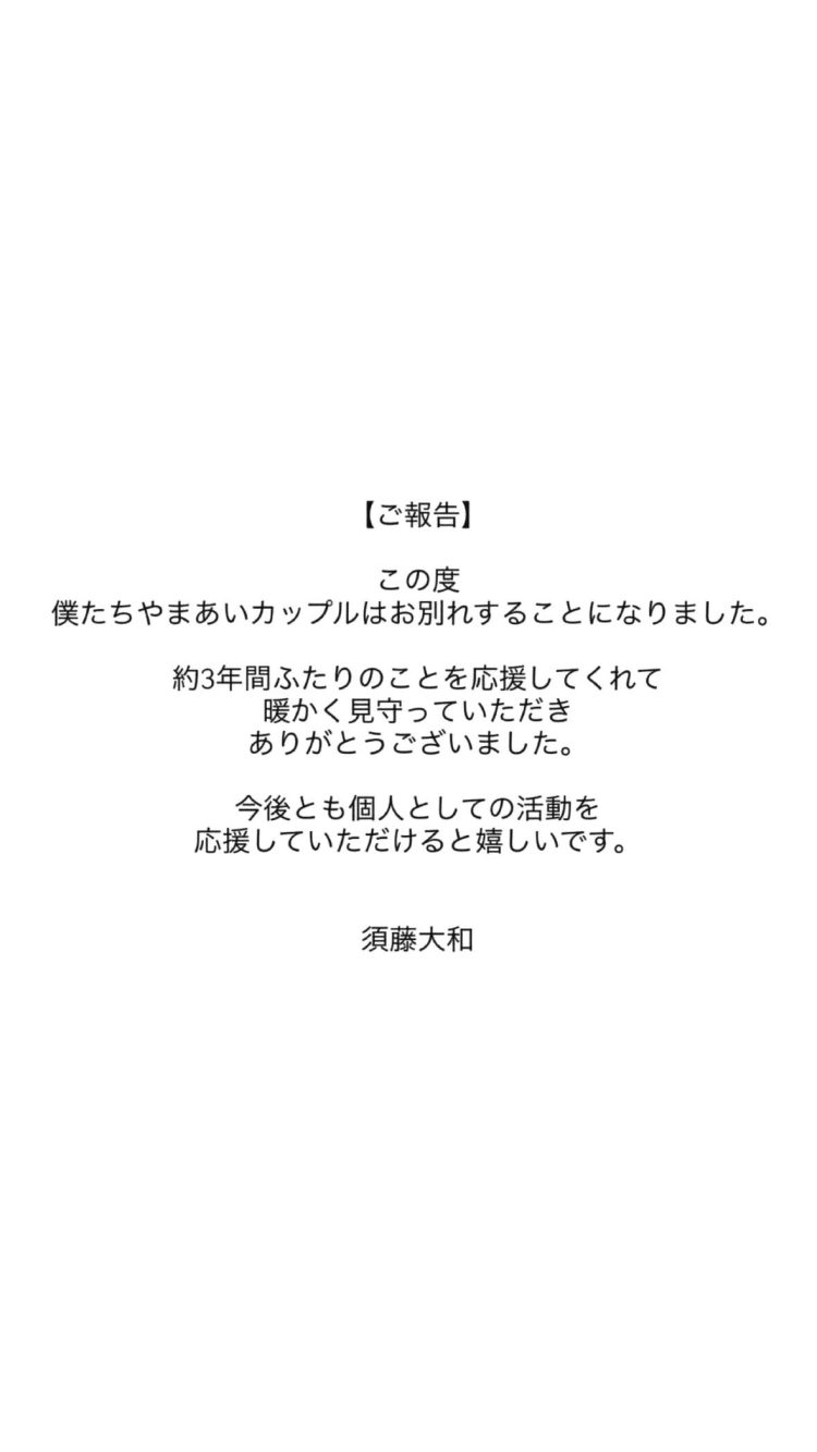 ABEMAの高校生による青春恋愛番組「今日、好きになりました。」に出演していたやまあいカップルこと、須藤大和さんとあいさ(細川愛沙)さんが、2026年1月29日にそれぞれのインスタグラムのストーリーズを通じて、破局を報告しました。