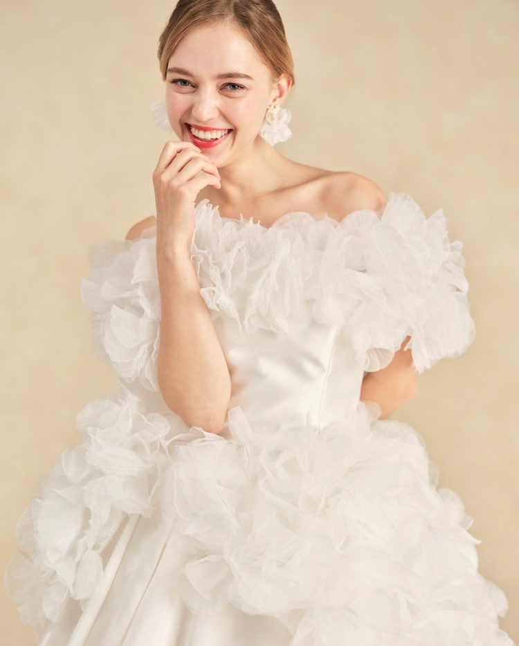 3Dフラワーケープは、ボリュームがありながらも軽やかな素材でデコルテをすっきりと演出。まるで花束を抱きしめているような多幸感に包まれ、アシンメトリーなデザインがスタイリッシュな印象をプラス♡