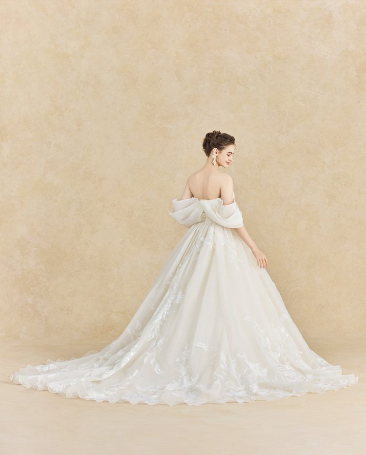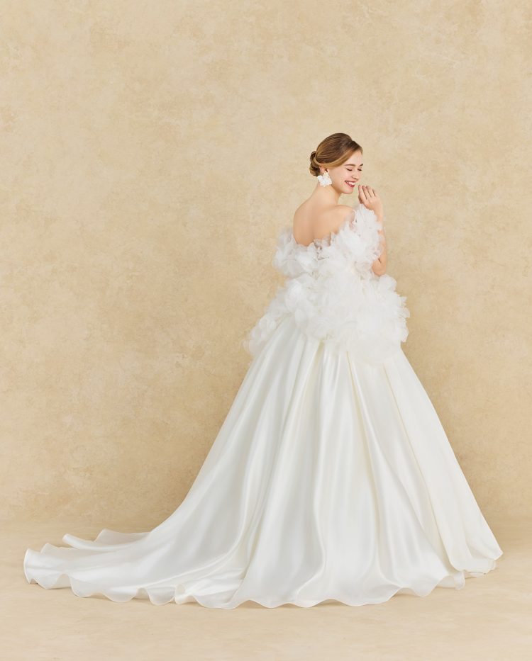 チュールとオーガンジーを用いたケープは奥行きと立体感をもたらし、圧倒的な存在感を放つデザイン。
