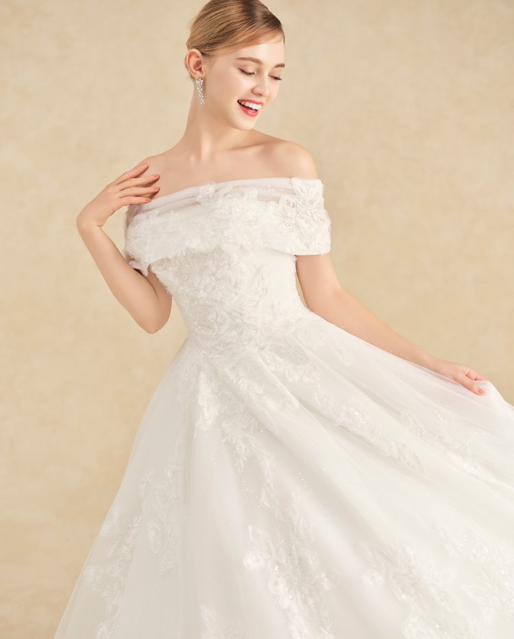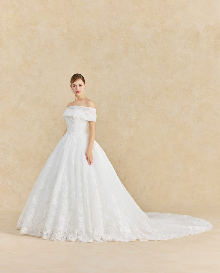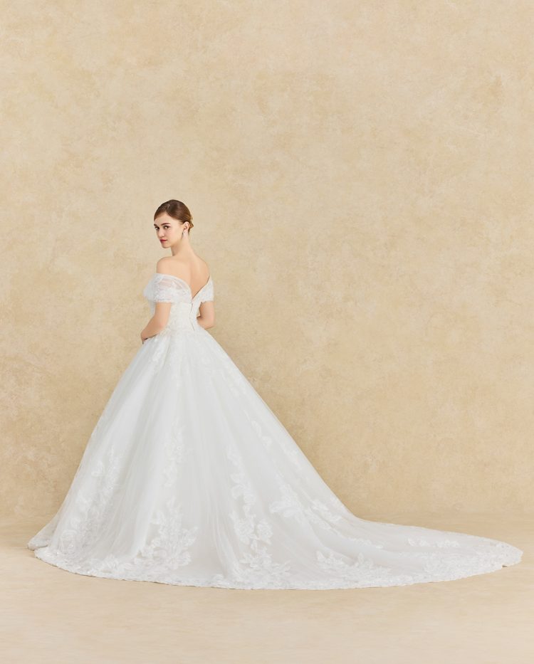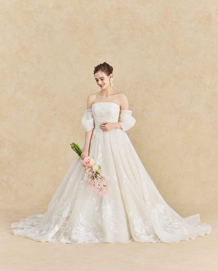 大輪の芍薬をモチーフにしたレースがドレス全体を彩る、幸福感あふれるウエディングドレス。