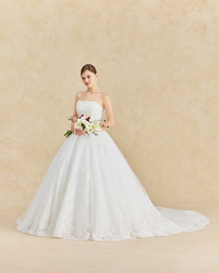 レースの下にはスパンコールチュールをあしらい、光を受けて上品な輝きを演出。裾まで贅沢に施されたレースが動くたびに優雅に揺らめく、可憐な1着です。