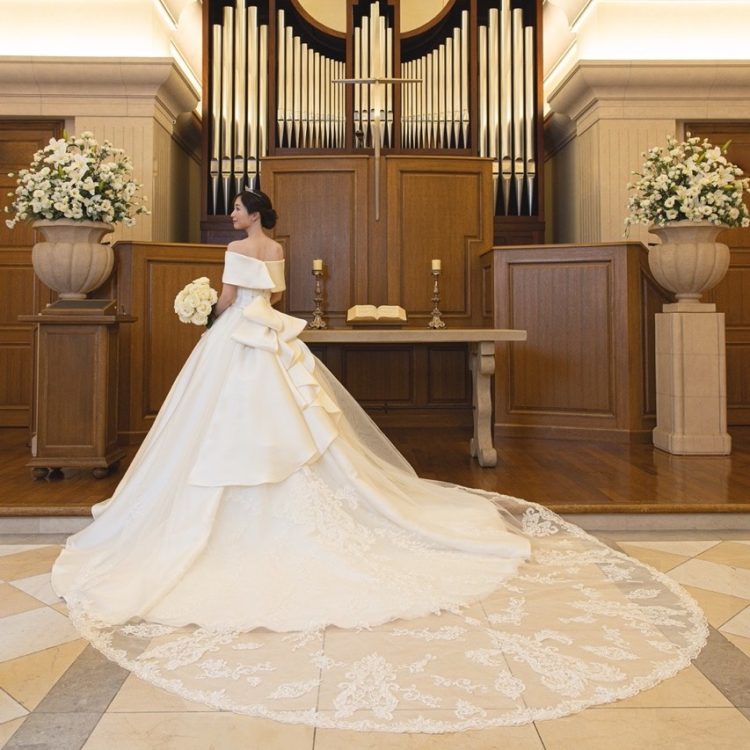 また、大ぶりなラッフルフリルが印象的なバックリボンと、180cmものロングトレーンがバックスタイルを華やかに演出。帝国ホテル 大阪を象徴する大階段やバージンロードに美しく映え、息を呑むほどドラマチックな余韻を残します。