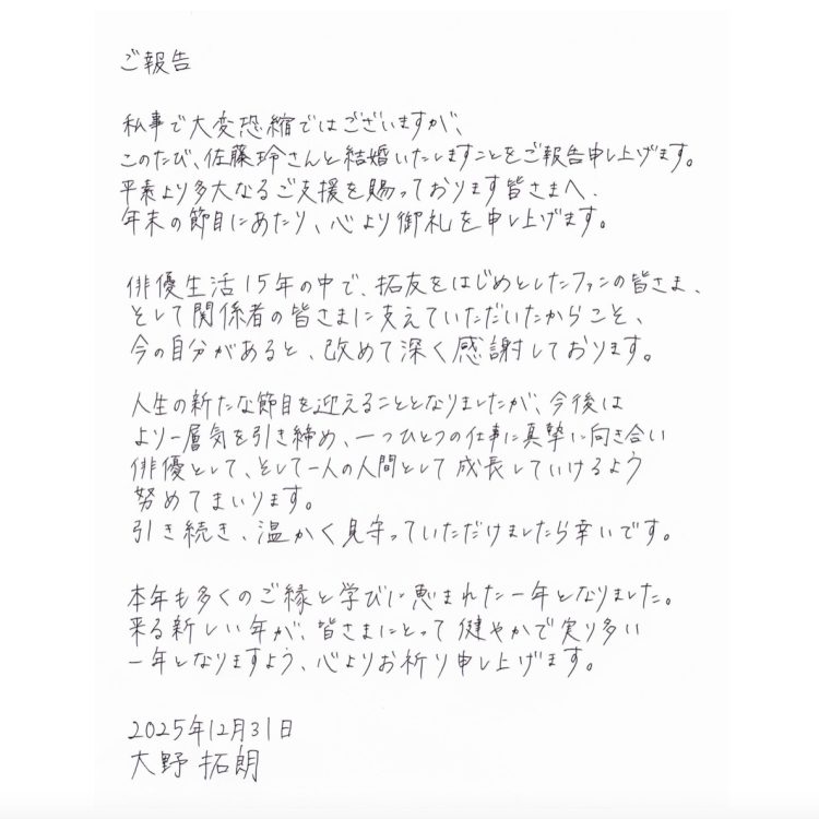 俳優の大野拓朗さんと俳優の佐藤玲さんがそれぞれのSNSを更新し、2025年12月31日に結婚を発表しました!