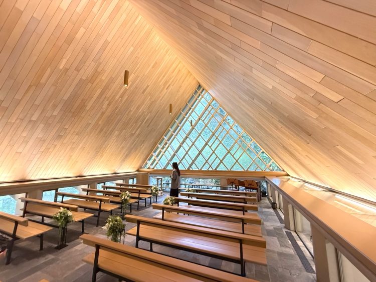 天井高約8メートルの三角形のチャペルは