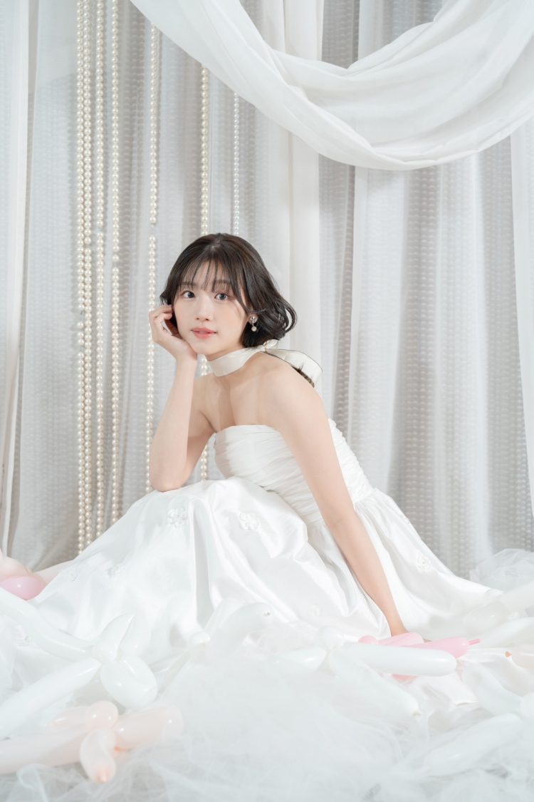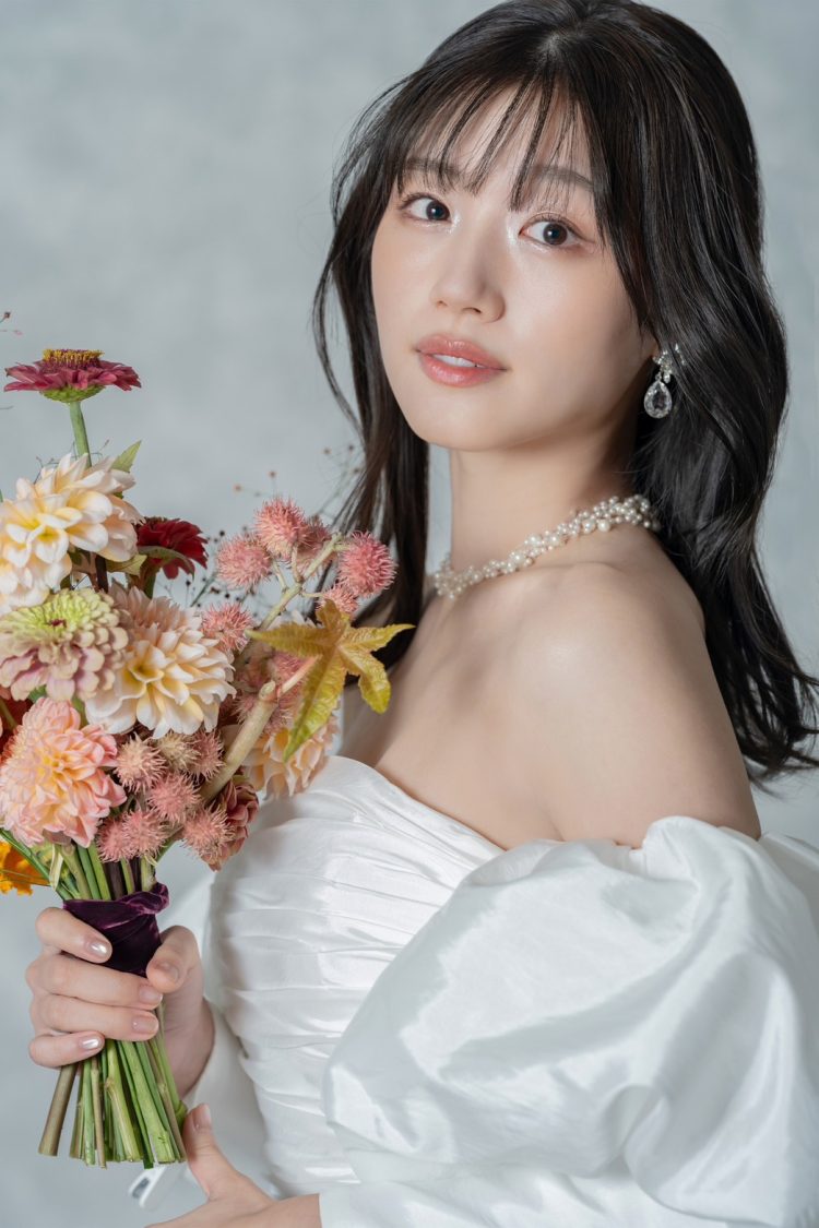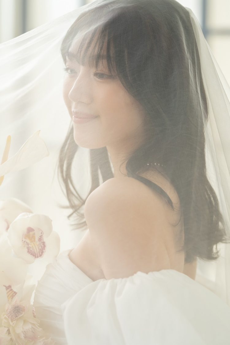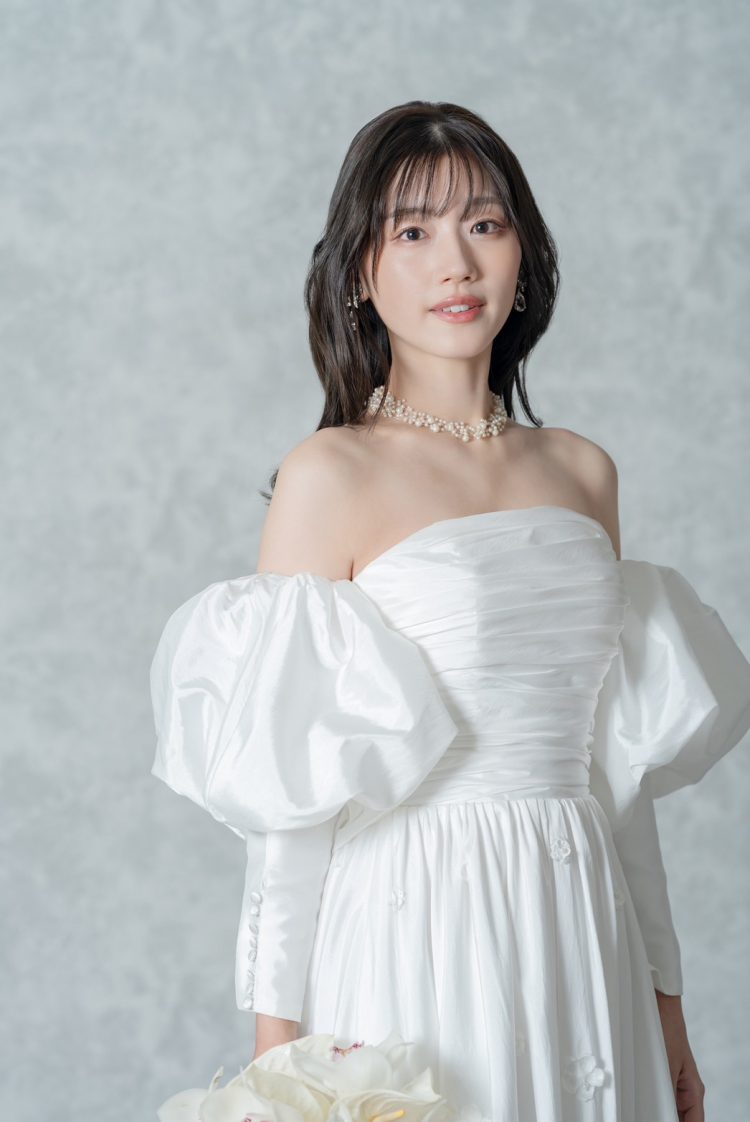 ウェディング:私は普段、柔らかくてふんわりとした雰囲気を持たれることが多いんです。でも今回は、あえてシンプルで華やかすぎない、きれいめで大人っぽいドレスに挑戦してみたいと思って選びました。普段とは違う雰囲気を纏うことができてとても嬉しいです。