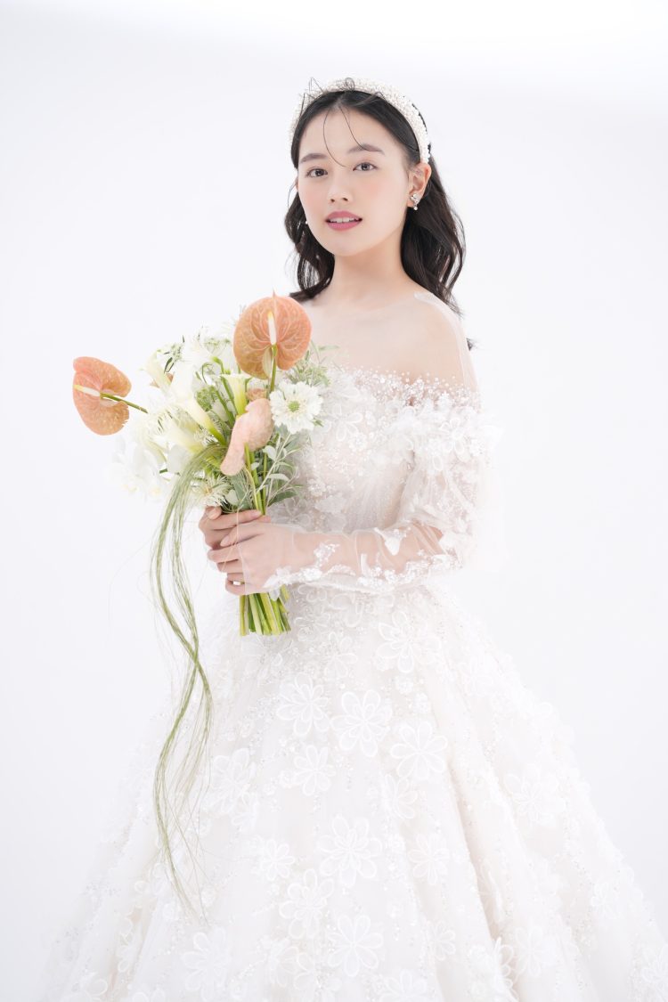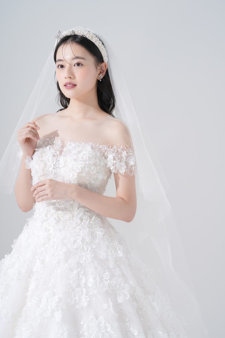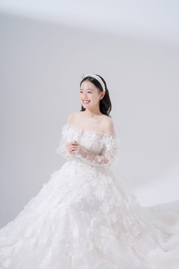 ドレス全体に施された3Dフラワーとビージングが揺れるたびに煌めき、柔らかな素材と相まって可憐でドラマティックな花嫁を演出します。