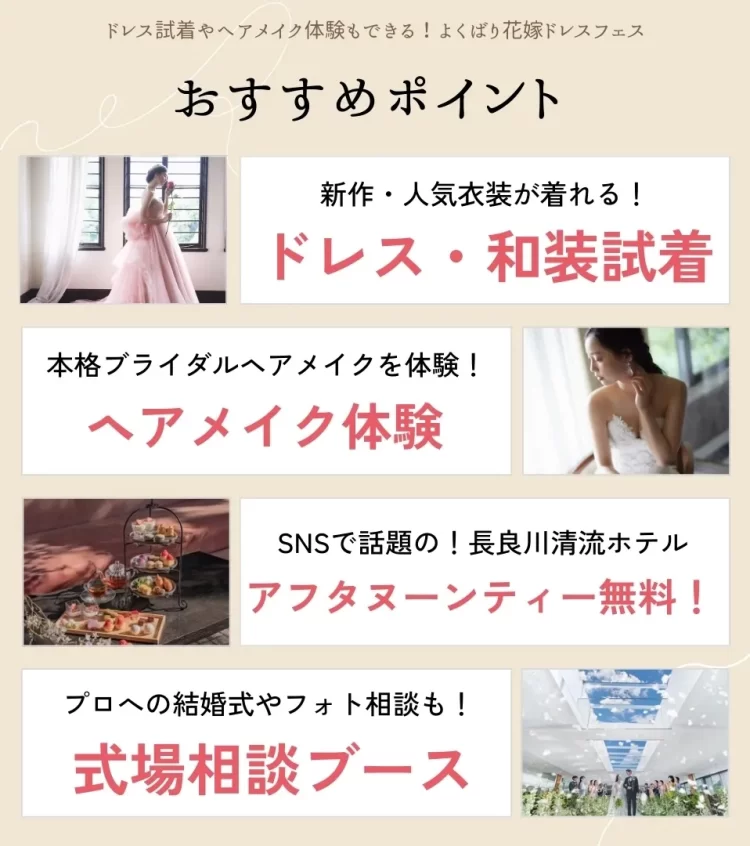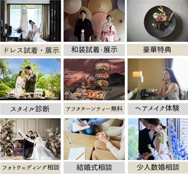 ドレス試着や結婚式相談、スタイル診断を始めとした体験コンテンツと
